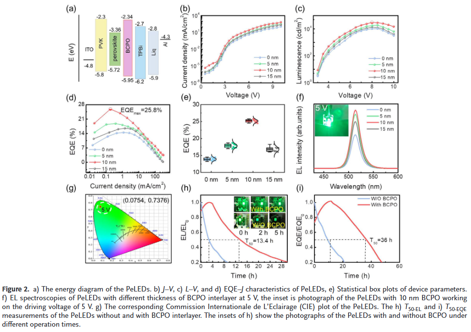 二是突破效率-稳定性权衡瓶颈:器件外量子效率达25.8%,T50,EL寿命达13.4h,是目前综合性能最优的绿光PeLEDs之一。