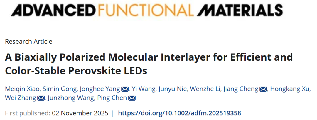 近日,学院柔性光电薄膜与先进感知器件团队的程江教授在材料科学领域国际顶刊《AdvancedFunctional Materials》(中科院一区,影响因子19)发表了一篇题为“ABiaxially Polarized Molecular Interlayer for Efficient andColor-StablePerovskite LEDs”的研究论文(M.Xiao, S. Gong, J. Yang, et al. Adv. Funct. Mater. (2025): e19358)。