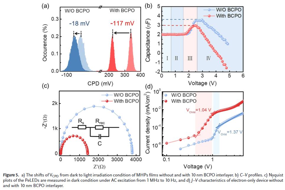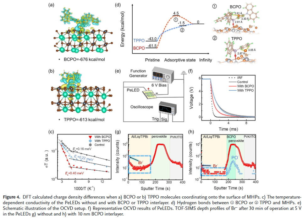 三是多尺度机制深度揭示:结合DFT、KPFM、TOF-SIMS等多种表征,阐明BCPO在能带调控、缺陷钝化与离子迁移抑制方面的协同作用机制。