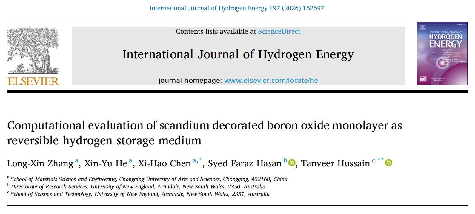bw必威西汉姆联官方网站陈西浩副教授指导的材料科学与工程专业2022级本科生张龙鑫在氢能固态存储研究领域取得重要进展,其研究成果Computationalevaluation of scandium decorated boron oxide monolayer as reversiblehydrogen storage medium在国际知名期刊《InternationalJournal of HydrogenEnergy》(中科院二区,影响因子8.3)上发表,充分展现了学院在高水平科研与本科生创新能力培养方面的双重成效。