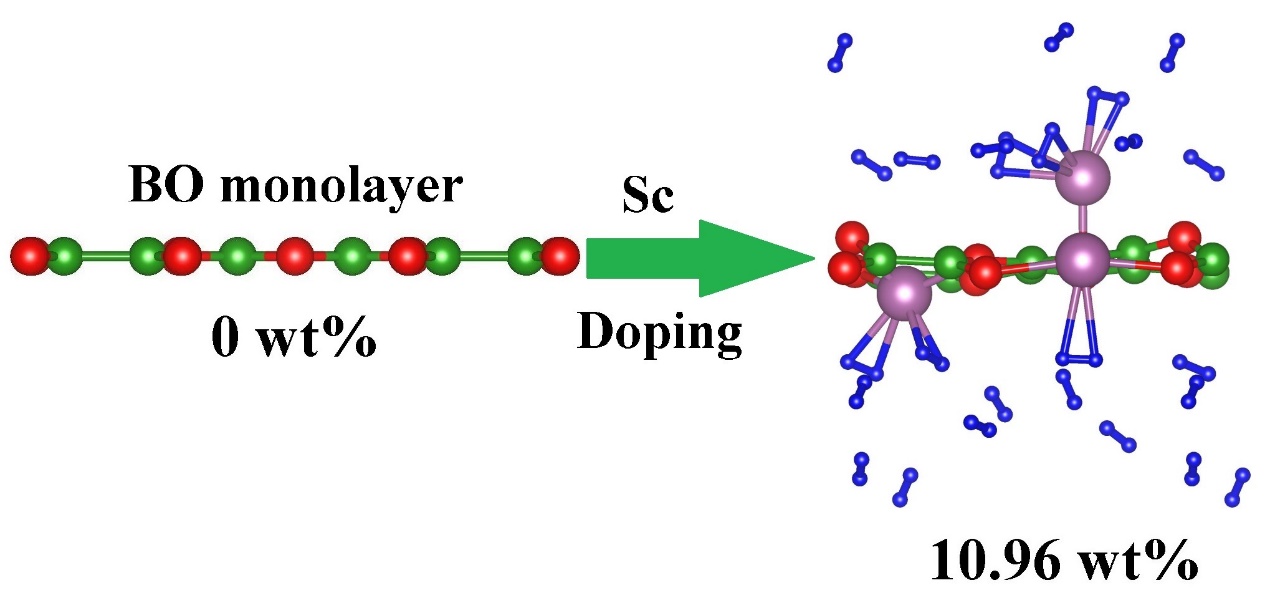 氢能存储是氢能应用中的瓶颈环节。传统的高压气态存储和低温液态存储技术存在着易泄露和高能耗的缺点。针对这一关键瓶颈,研究团队创新性地提出了采用Sc团簇修饰BO单层,形成3Sc@BO近室温可逆复合储氢材料。这种新型复合材料具有优异的热稳定性。该材料达到满存储密度时,对氢分子平均吸附能为-0.346eV/H2。在近室温条件和标准大气压下,质量和体积存储密度分别高达10.96wt%和81.49g/L,远超国际氢能存储行业公认的4.5wt%和45g/L标准。该研究将为理论和实验上设计新型近室温可逆储氢材料提供参考。