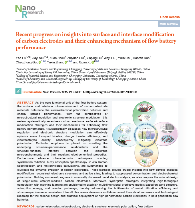 近日,我校郭朝中教授领衔的电化学能源利用材料创新团队联合重庆大学张育新教授团队、中国石油大学(北京)徐泉教授团队在高水平国际学术期刊《Nano Research》(影响因子9.0,中科院材料科学SCI一区TOP期刊)发表题为《Recent progress on insights into surface and interface modification of carbon electrodes and their enhancing mechanism of flow battery performance》的综述论文。重庆文理学院为第一通讯单位,我校郭朝中教授为共同通讯作者,刘瑶老师为论文第一作者。